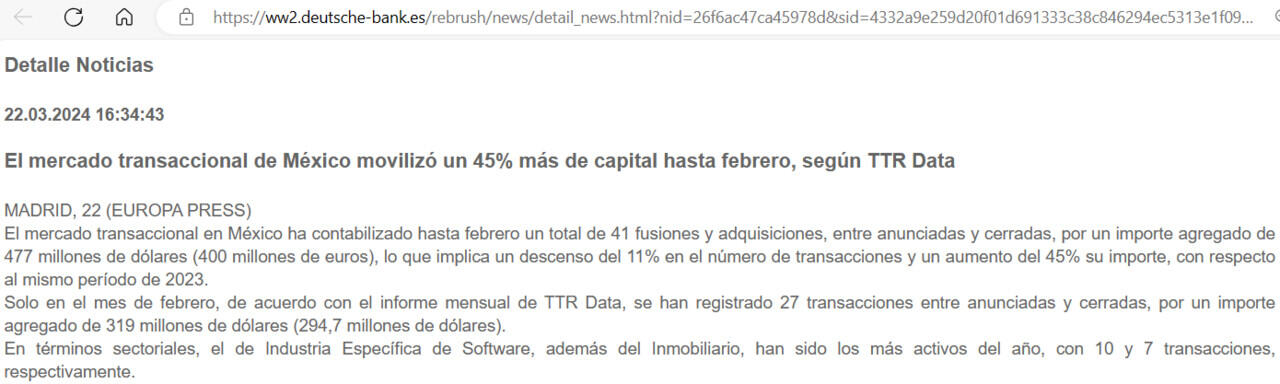 Solo en el mes de febrero, de acuerdo con el informe mensual de TTR Data, se han registrado 27 transacciones entre anunciadas y cerradas, por un importe agregado de 319 millones de dólares (294,7 millones de dólares).
