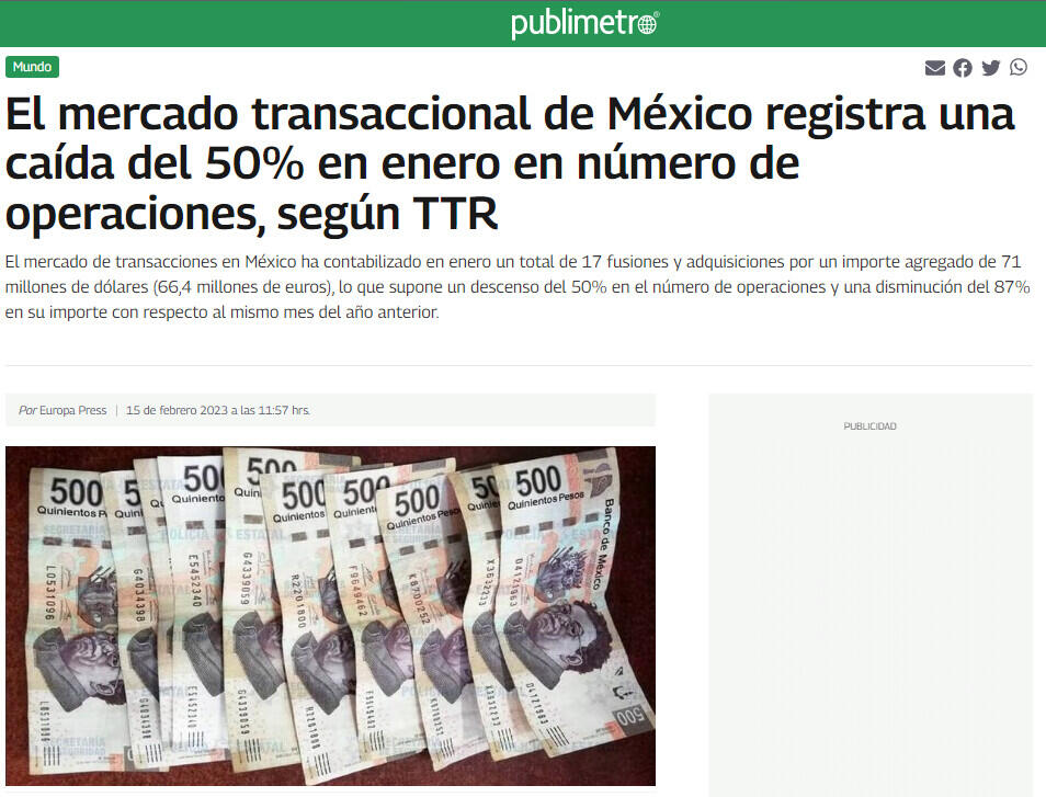 El mercado transaccional de México registra una caída del 50% en enero en número de operaciones, según TTR