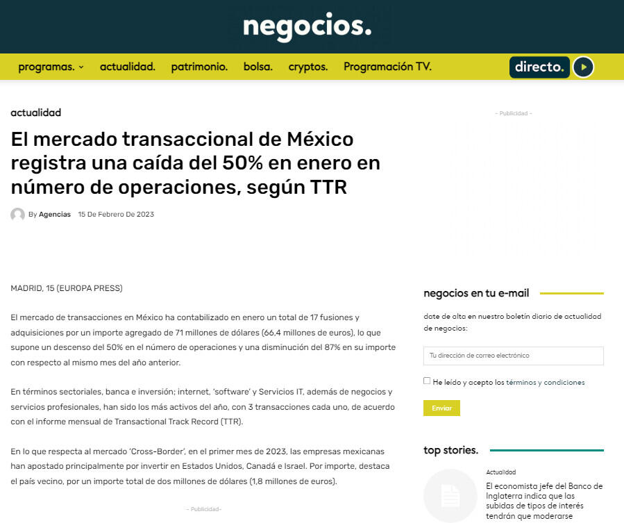 El mercado transaccional de México registra una caída del 50% en enero en número de operaciones, según TTR