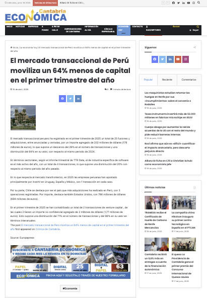 El mercado transaccional peruano ha registrado en el primer trimestre de 2025 un total de 25 fusiones y adquisiciones, entre anunciadas y cerradas, por un importe agregado de 202 millones de dólares (178 millones de euros), lo que supone un descenso del 39% en el número de transacciones y una disminución del 64% en su valor, con respecto al mismo periodo de 2024.