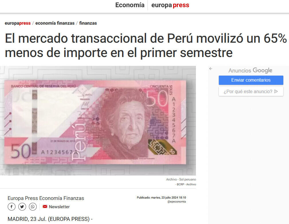El mercado transaccional de Perú movilizó un 65% menos de importe en el primer semestre