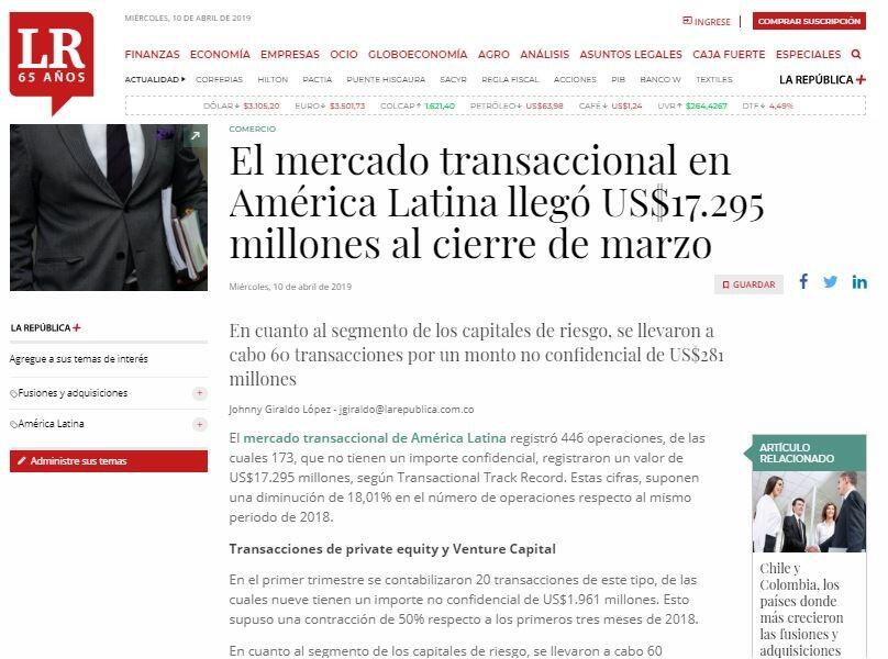 El mercado transaccional en América Latina llegó US$17.295 millones al cierre de marzo