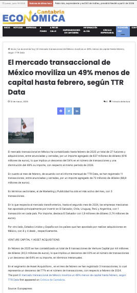 The post El mercado transaccional de México moviliza un 49% menos de capital hasta febrero, según TTR Data first appeared on Crónica de Cantabria.