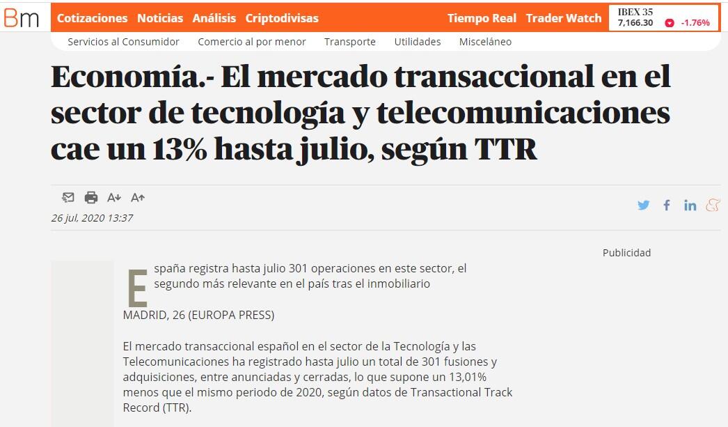 El mercado transaccional español en el sector de la Tecnología y las Telecomunicaciones ha registrado hasta julio un total de 301 fusiones y adquisiciones, entre anunciadas y cerradas, lo que supone un 13,01% menos que el mismo periodo de 2020, según datos de Transactional Track Record (TTR).