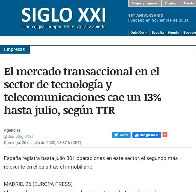 El mercado transaccional español en el sector de la Tecnología y las Telecomunicaciones ha registrado hasta julio un total de 301 fusiones y adquisiciones, entre anunciadas y cerradas, lo que supone un 13,01% menos que el mismo periodo de 2020, según datos de Transactional Track Record (TTR).
