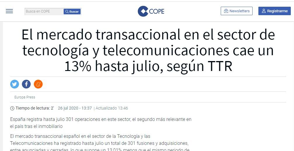 Asimismo, TTR remarca que el sector de Tecnología y Telecomunicaciones ha registrado hasta la fecha un aumento del 328,62% en su capital movilizado en términos interanuales, lo que lo convierte en "uno de los sectores más activos en el mercado ibérico a lo largo del año".