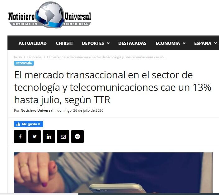 El mercado transaccional en el sector de tecnología y telecomunicaciones cae un 13% hasta julio, según TTR