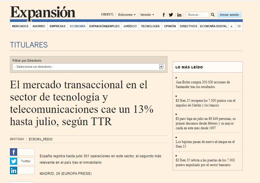 El mercado transaccional en el sector de tecnología y telecomunicaciones cae un 13% hasta julio, según TTR