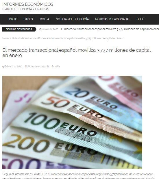 Según el informe mensual de TTR, el mercado transaccional español ha registrado 3.777 millones de euros en enero en 53 fusiones y adquisiciones, lo que supone una disminución del 39,9% en el número de transacciones y del 40,55% en el importe de las mismas.