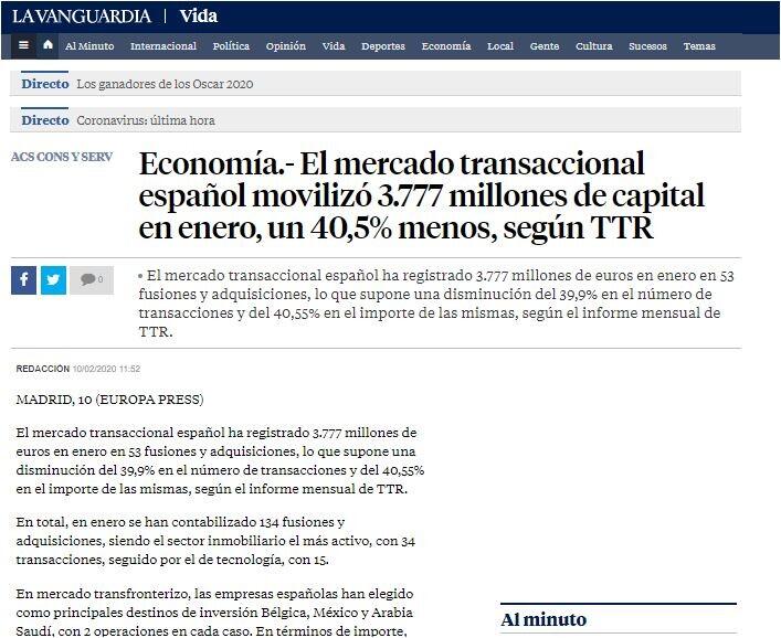 El mercado transaccional español ha registrado 3.777 millones de euros en enero en 53 fusiones y adquisiciones, lo que supone una disminución del 39,9% en el número de transacciones y del 40,55% en el importe de las mismas, según el informe mensual de TTR.
