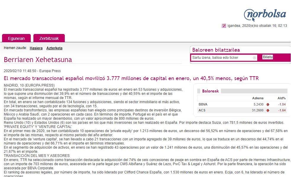 En enero, TTR ha seleccionado como transacción destacada la adquisición del 74% de seis concesiones de peaje en sombra en España de ACS por parte de Hermes Infraestructure, con un importe de 703 millones de euros, asesorada en la parte legal por CMS Albiñana y Suárez de Lezo, PwC Tax & Legal y Ashurst. Por la parte financiera, la operación ha sido asesorada por BBVA Corporate.