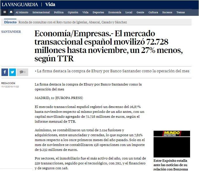 TTR ha seleccionado como transacción destacada la adquisición del 50,1% de Ebury por parte de Banco Santander en el mes de noviembre. La entidad presidida por Ana Botín anunció que adquirirá el 50,1% de la plataforma de pagos y divisas por 350 millones de libras (405 millones de euros), de los que 70 millones (81 millones de euros) corresponderán a nuevas acciones.