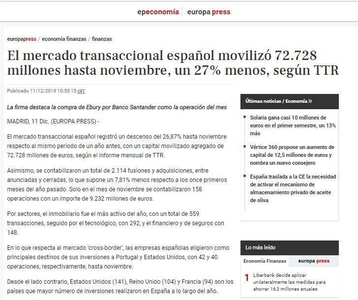 TTR ha seleccionado como transacción destacada la adquisición del 50,1% de Ebury por parte de Banco Santander en el mes de noviembre. La entidad presidida por Ana Botín anunció que adquirirá el 50,1% de la plataforma de pagos y divisas por 350 millones de libras (405 millones de euros), de los que 70 millones (81 millones de euros) corresponderán a nuevas acciones.