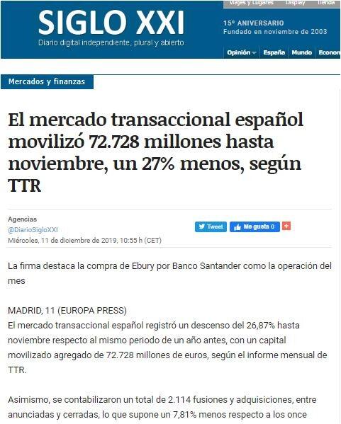 TTR ha seleccionado como transacción destacada la adquisición del 50,1% de Ebury por parte de Banco Santander en el mes de noviembre. La entidad presidida por Ana Botín anunció que adquirirá el 50,1% de la plataforma de pagos y divisas por 350 millones de libras (405 millones de euros), de los que 70 millones (81 millones de euros) corresponderán a nuevas acciones.
