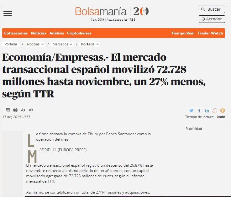TTR ha seleccionado como transacción destacada la adquisición del 50,1% de Ebury por parte de Banco Santander en el mes de noviembre. La entidad presidida por Ana Botín anunció que adquirirá el 50,1% de la plataforma de pagos y divisas por 350 millones de libras (405 millones de euros), de los que 70 millones (81 millones de euros) corresponderán a nuevas acciones.