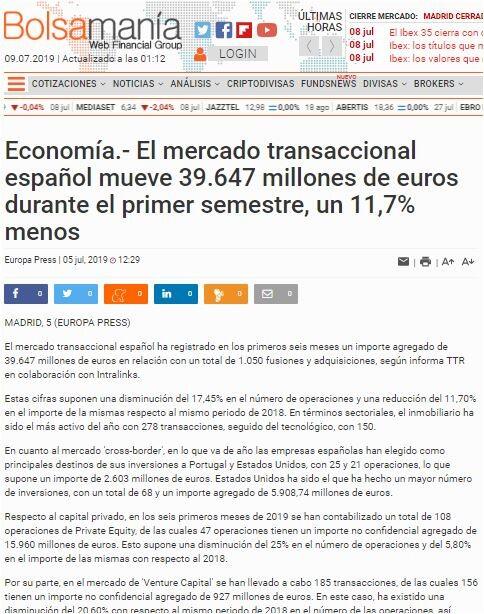 El mercado transaccional español mueve 39.647 millones de euros durante el primer semestre de 2019