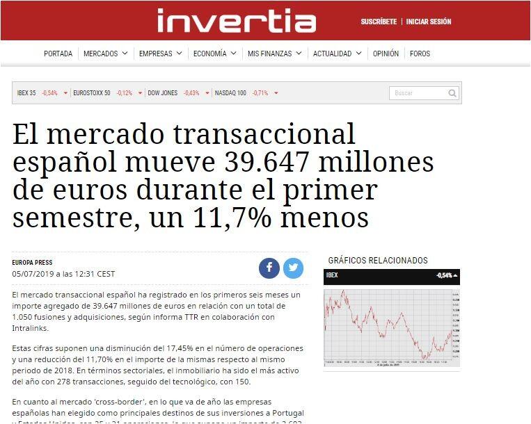 El mercado transaccional español ha registrado en los primeros seis meses un importe agregado de 39.647 millones de euros en relación con un total de 1.050 fusiones y adquisiciones, según informa TTR en colaboración con Intralinks.