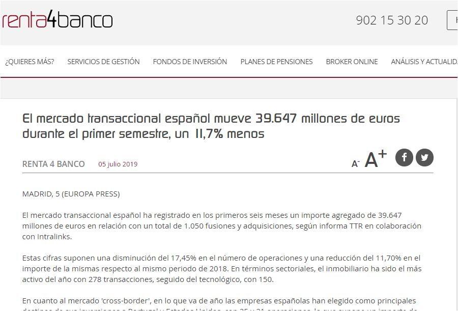 El mercado transaccional español ha registrado en los primeros seis meses un importe agregado de 39.647 millones de euros en relación con un total de 1.050 fusiones y adquisiciones, según informa TTR en colaboración con Intralinks.