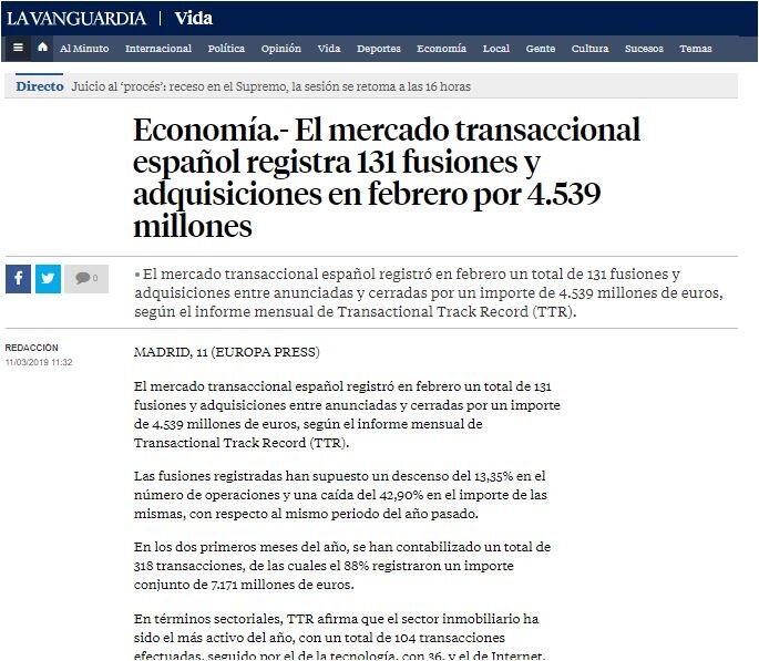 El mercado transaccional español registró en febrero un total de 131 fusiones y adquisiciones entre anunciadas y cerradas por un importe de 4.539 millones de euros, según el informe mensual de Transactional Track Record (TTR).