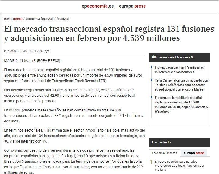 El mercado transaccional español registró en febrero un total de 131 fusiones y adquisiciones entre anunciadas y cerradas por un importe de 4.539 millones de euros, según el informe mensual de Transactional Track Record (TTR). Las fusiones registradas han supuesto un descenso del 13,35% en el número de operaciones y una caída del 42,90% en el importe de las mismas, con respecto al mismo periodo del año pasado.