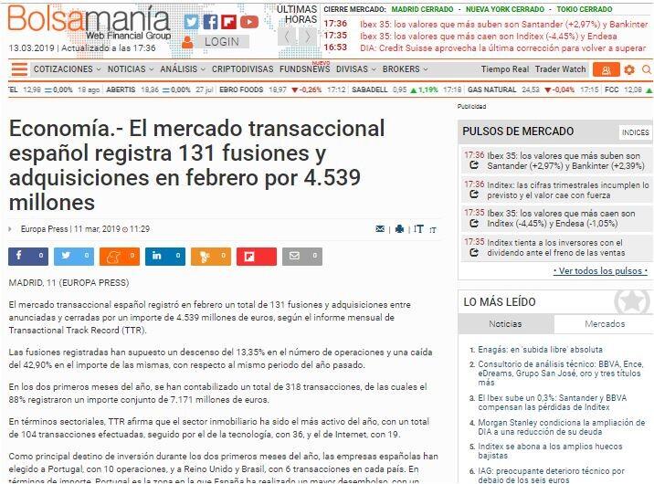 El mercado transaccional español registró en febrero un total de 131 fusiones y adquisiciones entre anunciadas y cerradas por un importe de 4.539 millones de euros, según el informe mensual de Transactional Track Record (TTR).