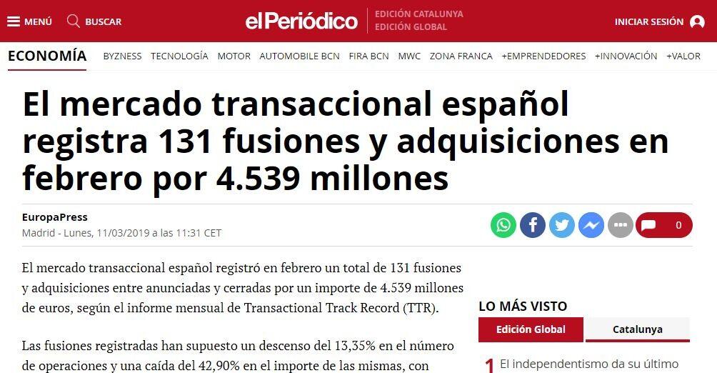 El mercado transaccional español registró en febrero un total de 131 fusiones y adquisiciones entre anunciadas y cerradas por un importe de 4.539 millones de euros, según el informe mensual de Transactional Track Record (TTR).