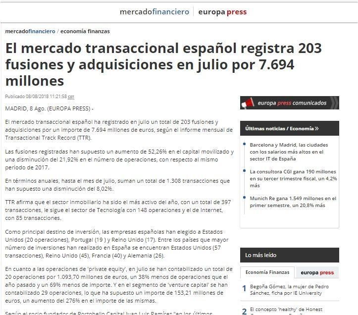 El mercado transaccional español ha registrado en julio un total de 203 fusiones y adquisiciones por un importe de 7.694 millones de euros, según el informe mensual de Transactional Track Record (TTR).