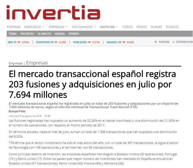 El mercado transaccional español ha registrado en julio un total de 203 fusiones y adquisiciones por un importe de 7.694 millones de euros, según el informe mensual de Transactional Track Record (TTR).