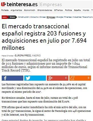 El mercado transaccional español ha registrado en julio un total de 203 fusiones y adquisiciones por un importe de 7.694 millones de euros, según el informe mensual de Transactional Track Record (TTR).