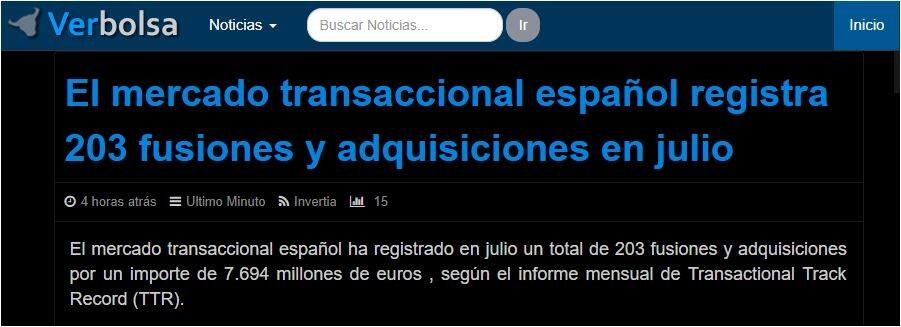 El mercado transaccional español ha registrado en julio un total de 203 fusiones y adquisiciones por un importe de 7.694 millones de euros , según el informe mensual de Transactional Track Record (TTR).