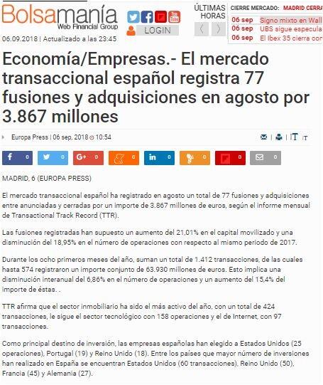 El mercado transaccional español ha registrado en agosto un total de 77 fusiones y adquisiciones entre anunciadas y cerradas por un importe de 3.867 millones de euros, según el informe mensual de Transactional Track Record (TTR).