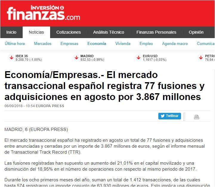 El mercado transaccional español ha registrado en agosto un total de 77 fusiones y adquisiciones entre anunciadas y cerradas por un importe de 3.867 millones de euros, según el informe mensual de Transactional Track Record (TTR).