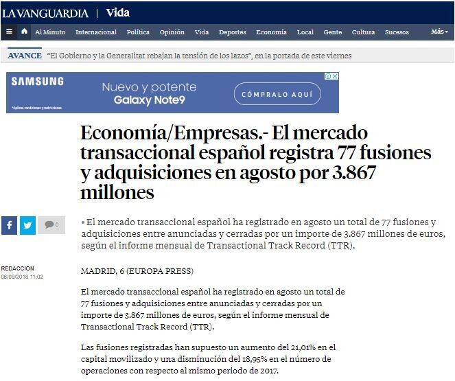 El mercado transaccional español ha registrado en agosto un total de 77 fusiones y adquisiciones entre anunciadas y cerradas por un importe de 3.867 millones de euros, según el informe mensual de Transactional Track Record (TTR).