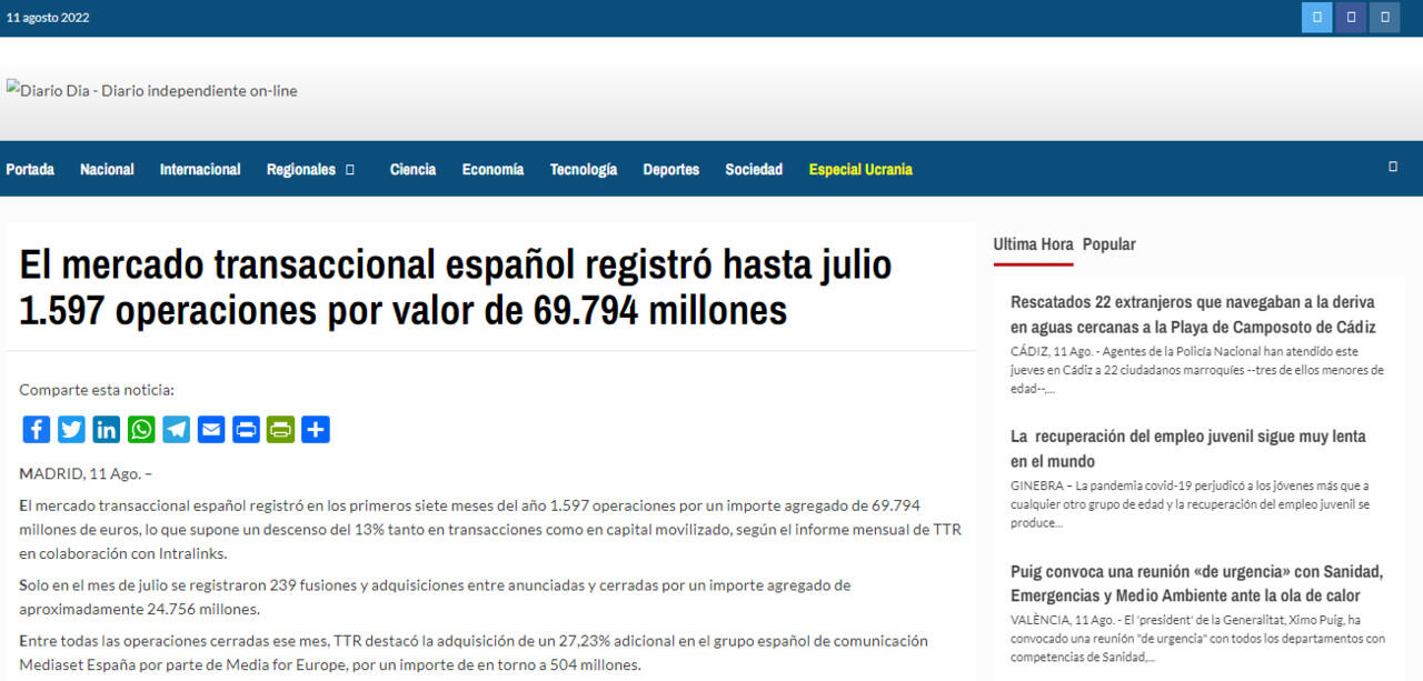 Entre todas las operaciones cerradas ese mes, TTR destacó la adquisición de un 27,23% adicional en el grupo español de comunicación Mediaset España por parte de Media for Europe, por un importe de en torno a 504 millones.