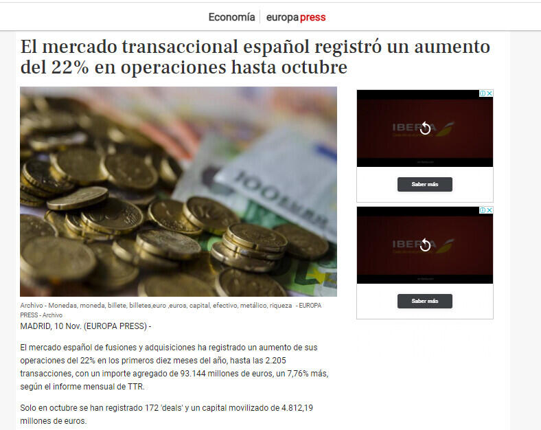 El mercado transaccional espaņol registrķ un aumento del 22% en operaciones hasta octubre