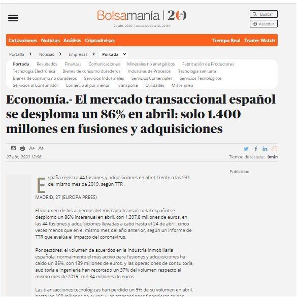 El volumen de los acuerdos del mercado transaccional español se desplomó un 86% interanual en abril, con 1.397,8 millones de euros, en las 44 fusiones y adquisiciones llevadas a cabo hasta el 24 de abril, cinco veces menos que en el mismo mes del año anterior, según un informe de TTR que evalúa el impacto del coronavirus.