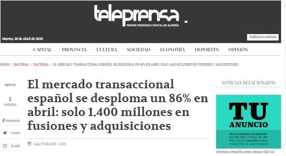 El volumen de los acuerdos del mercado transaccional español se desplomó un 86% interanual en abril, con 1.397,8 millones de euros, en las 44 fusiones y adquisiciones llevadas a cabo hasta el 24 de abril, cinco veces menos que en el mismo mes del año anterior, según un informe de TTR que evalúa el impacto del coronavirus.