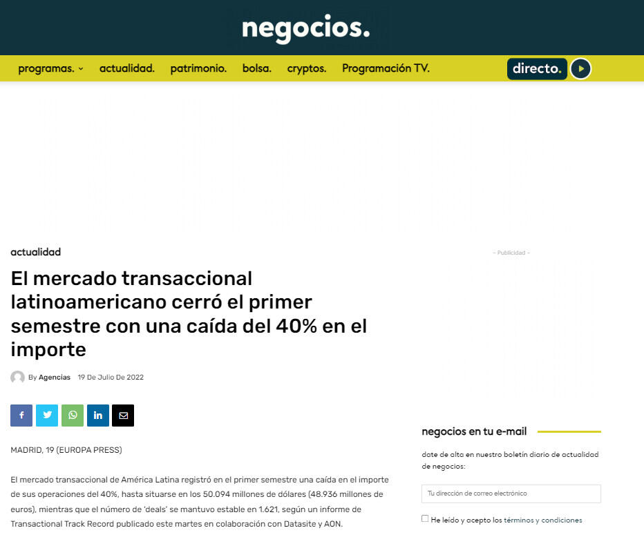 El mercado transaccional de América Latina registró en el primer semestre una caída en el importe de sus operaciones del 40%, hasta situarse en los 50.094 millones de dólares (48.936 millones de euros), mientras que el número de 'deals' se mantuvo estable en 1.621, según un informe de Transactional Track Record publicado este martes en colaboración con Datasite y AON.
