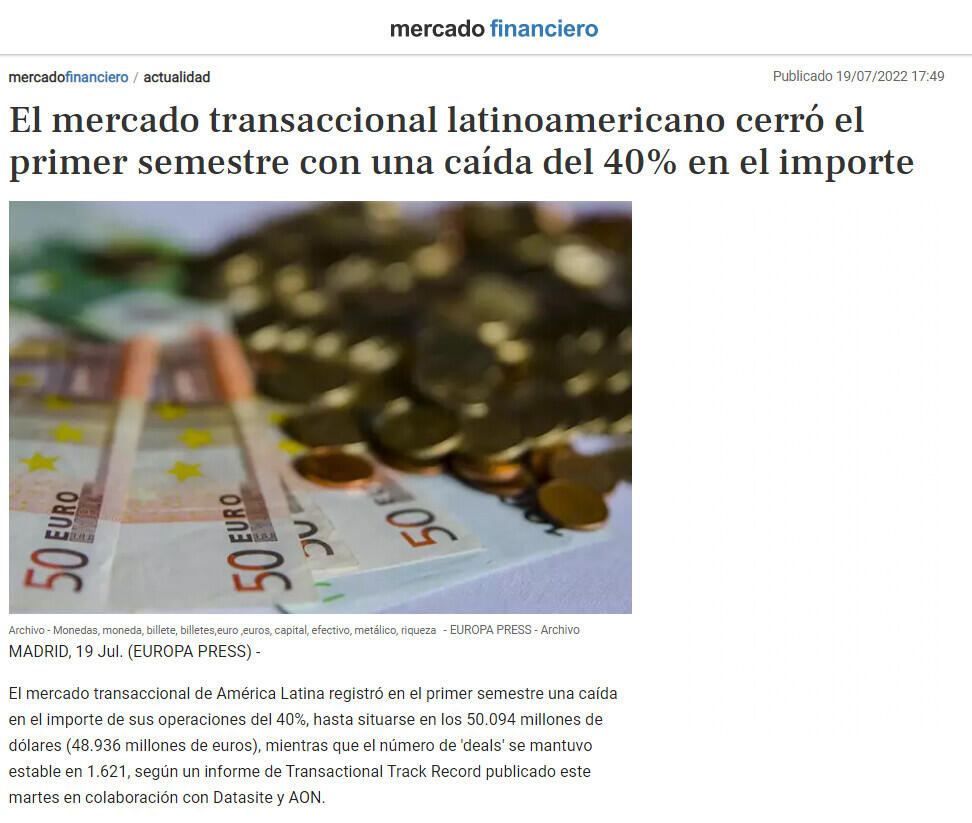 El mercado transaccional de América Latina registró en el primer semestre una caída en el importe de sus operaciones del 40%, hasta situarse en los 50.094 millones de dólares (48.936 millones de euros), mientras que el número de 'deals' se mantuvo estable en 1.621, según un informe de Transactional Track Record publicado este martes en colaboración con Datasite y AON.