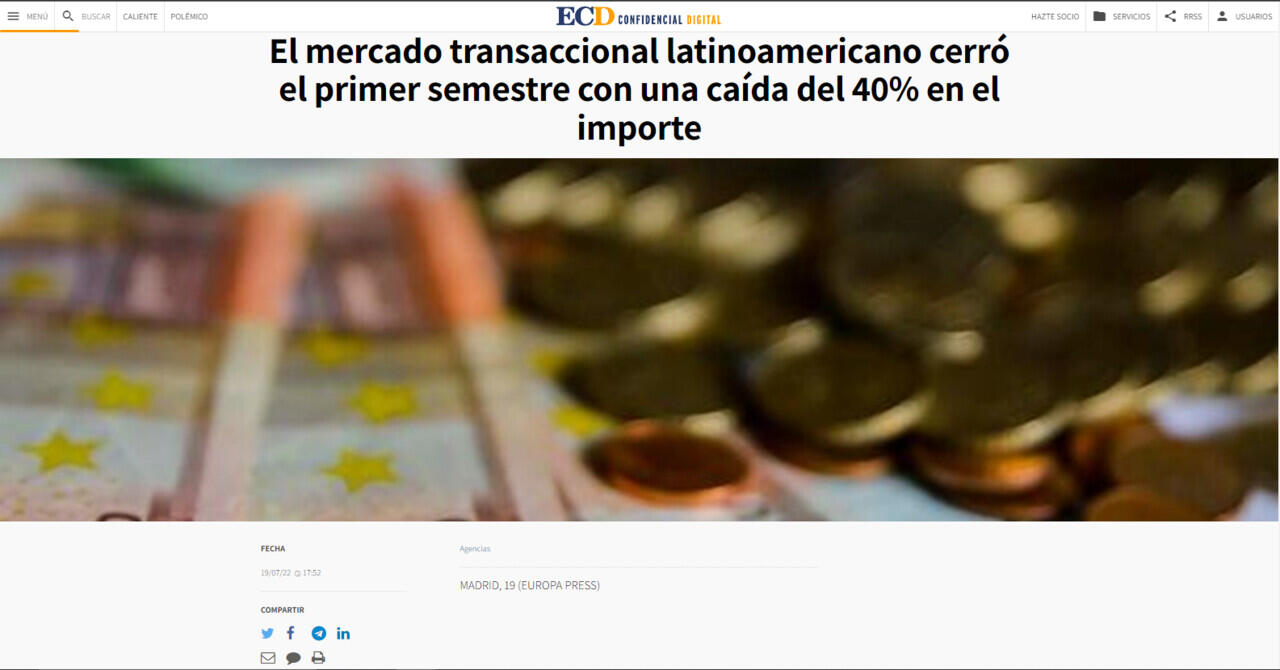 El mercado transaccional latinoamericano cerró el primer semestre con una caída del 40% en el importe