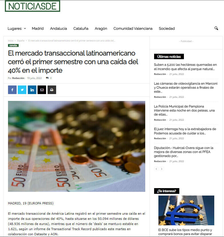 El mercado transaccional de América Latina registró en el primer semestre una caída en el importe de sus operaciones del 40%, hasta situarse en los 50.094 millones de dólares (48.936 millones de euros), mientras que el número de ‘deals’ se mantuvo estable en 1.621, según un informe de Transactional Track Record publicado este martes en colaboración con Datasite y AON.