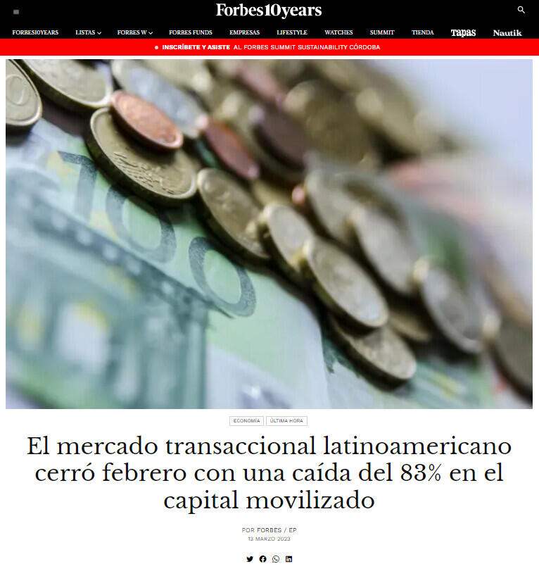 El mercado transaccional latinoamericano cerró febrero con una caída del 83% en el capital movilizado