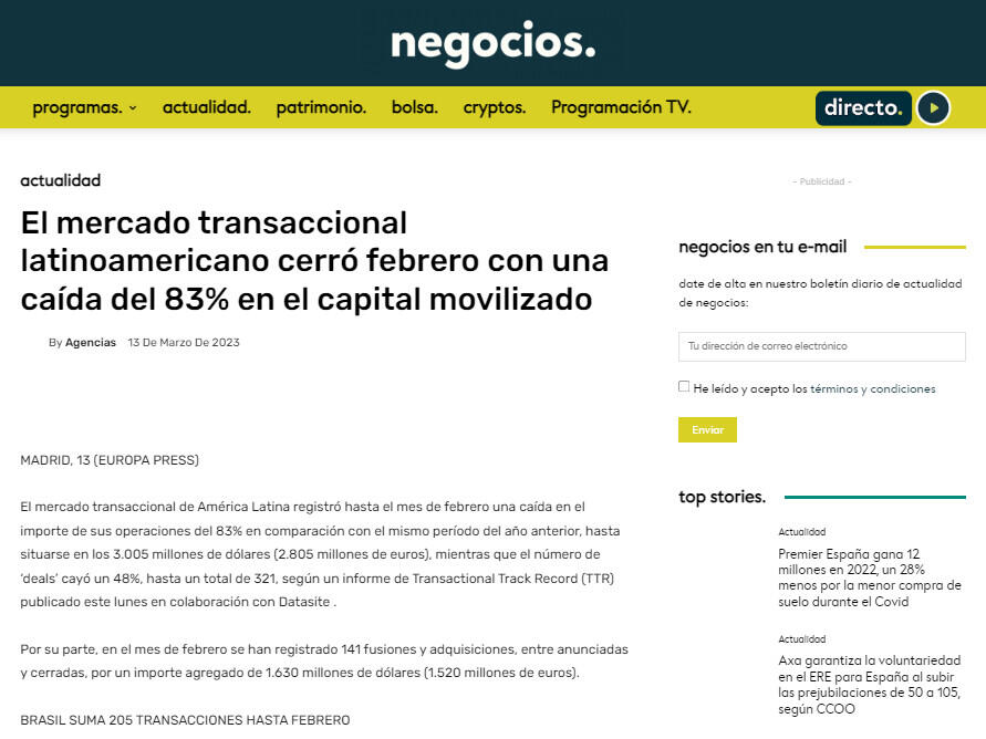 El mercado transaccional de América Latina registró hasta el mes de febrero una caída en el importe de sus operaciones del 83% en comparación con el mismo período del año anterior, hasta situarse en los 3.005 millones de dólares (2.805 millones de euros), mientras que el número de ‘deals’ cayó un 48%, hasta un total de 321, según un informe de Transactional Track Record (TTR) publicado este lunes en colaboración con Datasite .
