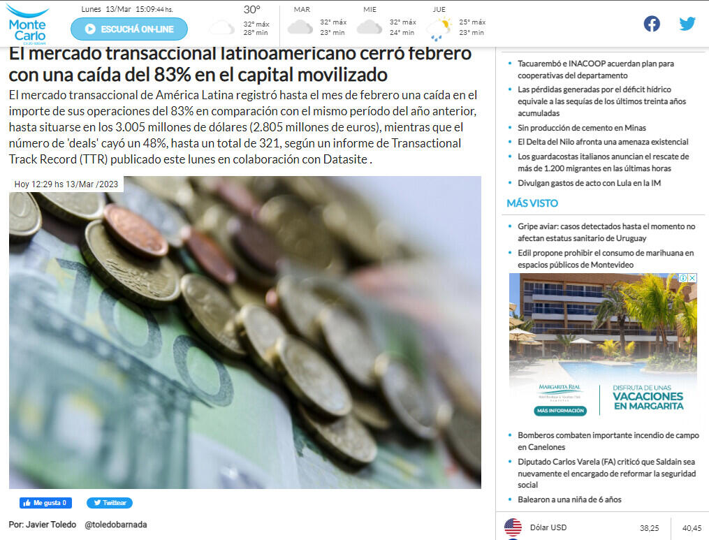 El mercado transaccional latinoamericano cerró febrero con una caída del 83% en el capital movilizado