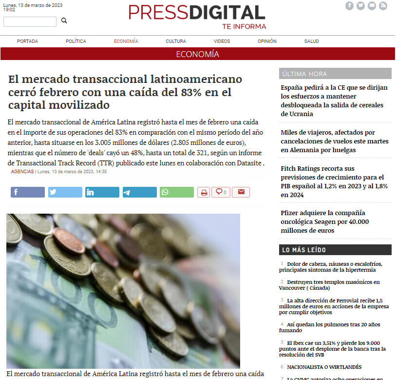El mercado transaccional de América Latina registró hasta el mes de febrero una caída en el importe de sus operaciones del 83% en comparación con el mismo período del año anterior, hasta situarse en los 3.005 millones de dólares (2.805 millones de euros), mientras que el número de 'deals' cayó un 48%, hasta un total de 321, según un informe de Transactional Track Record (TTR) publicado este lunes en colaboración con Datasite .