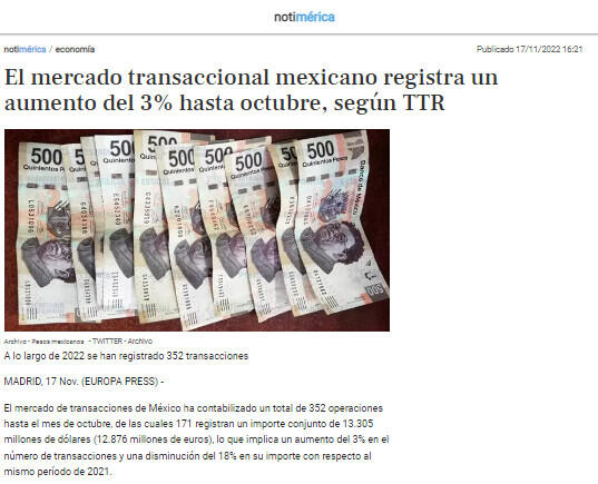 El mercado transaccional mexicano registra un aumento del 3% hasta octubre, según TTR