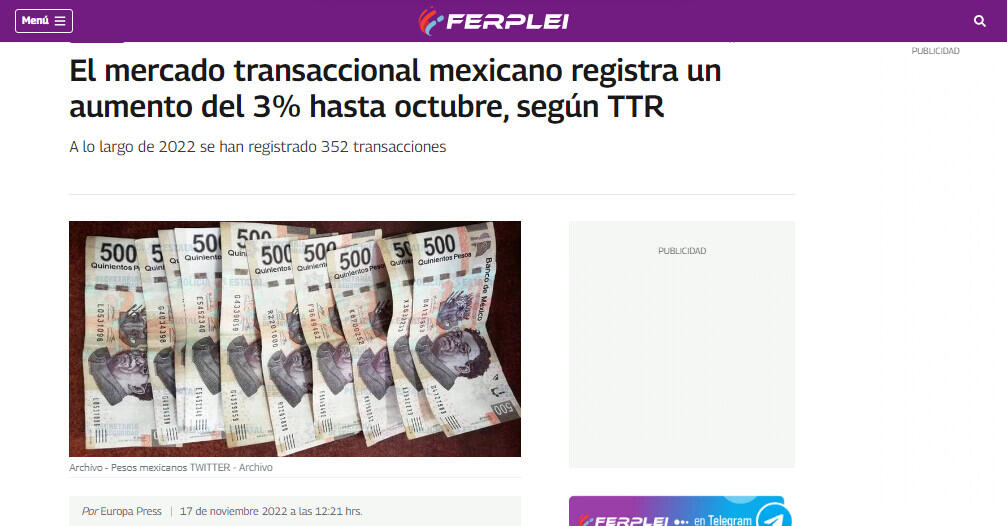 El mercado transaccional mexicano registra un aumento del 3% hasta octubre, según TTR