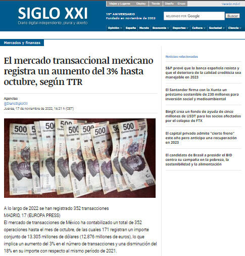 El mercado transaccional mexicano registra un aumento del 3% hasta octubre, según TTR