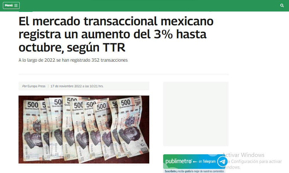 El mercado de transacciones de México ha contabilizado un total de 352 operaciones hasta el mes de octubre, de las cuales 171 registran un importe conjunto de 13.305 millones de dólares (12.876 millones de euros), lo que implica un aumento del 3% en el número de transacciones y una disminución del 18% en su importe con respecto al mismo período de 2021.
