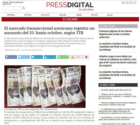 El mercado de transacciones de México ha contabilizado un total de 352 operaciones hasta el mes de octubre, de las cuales 171 registran un importe conjunto de 13.305 millones de dólares (12.876 millones de euros), lo que implica un aumento del 3% en el número de transacciones y una disminución del 18% en su importe con respecto al mismo período de 2021.